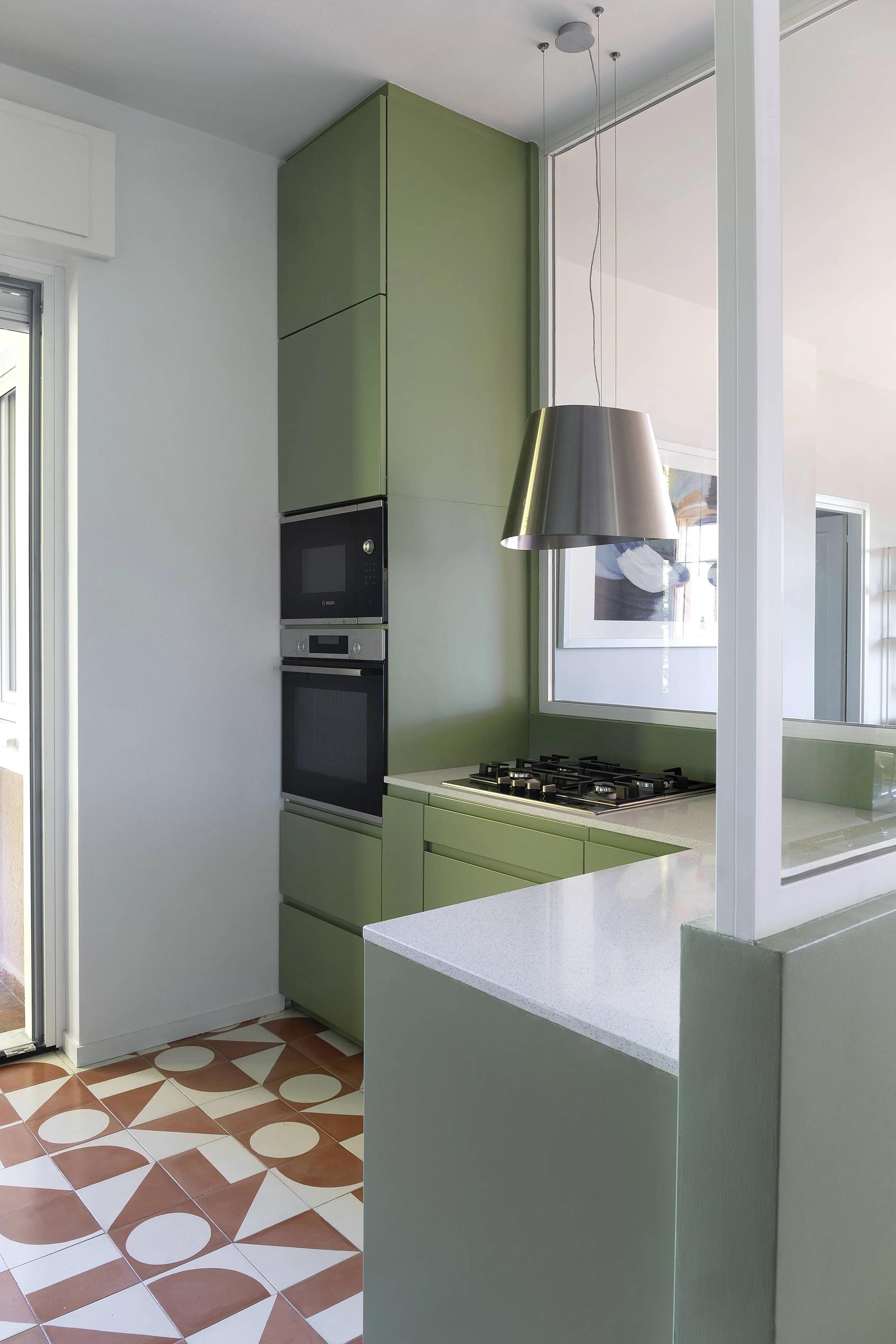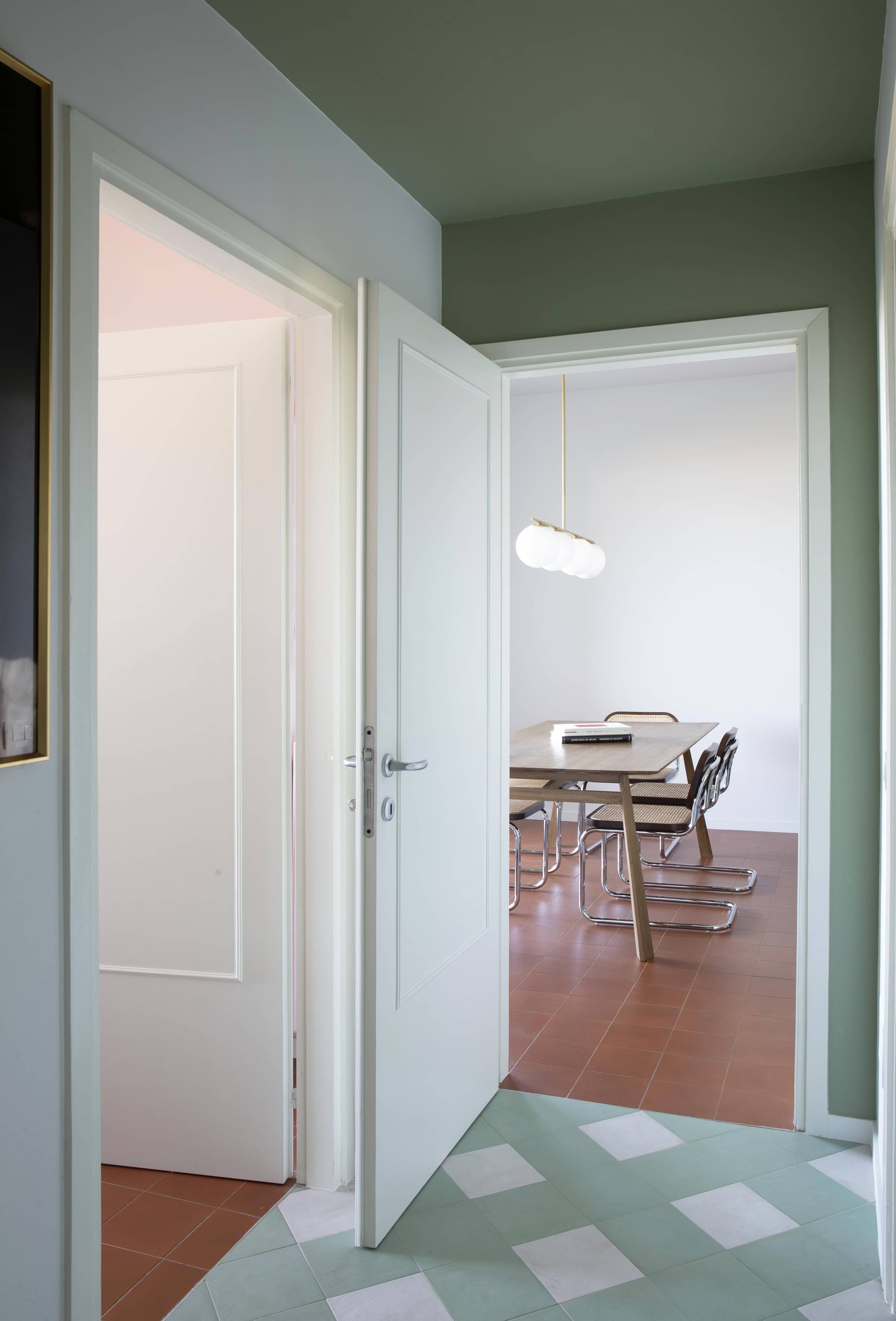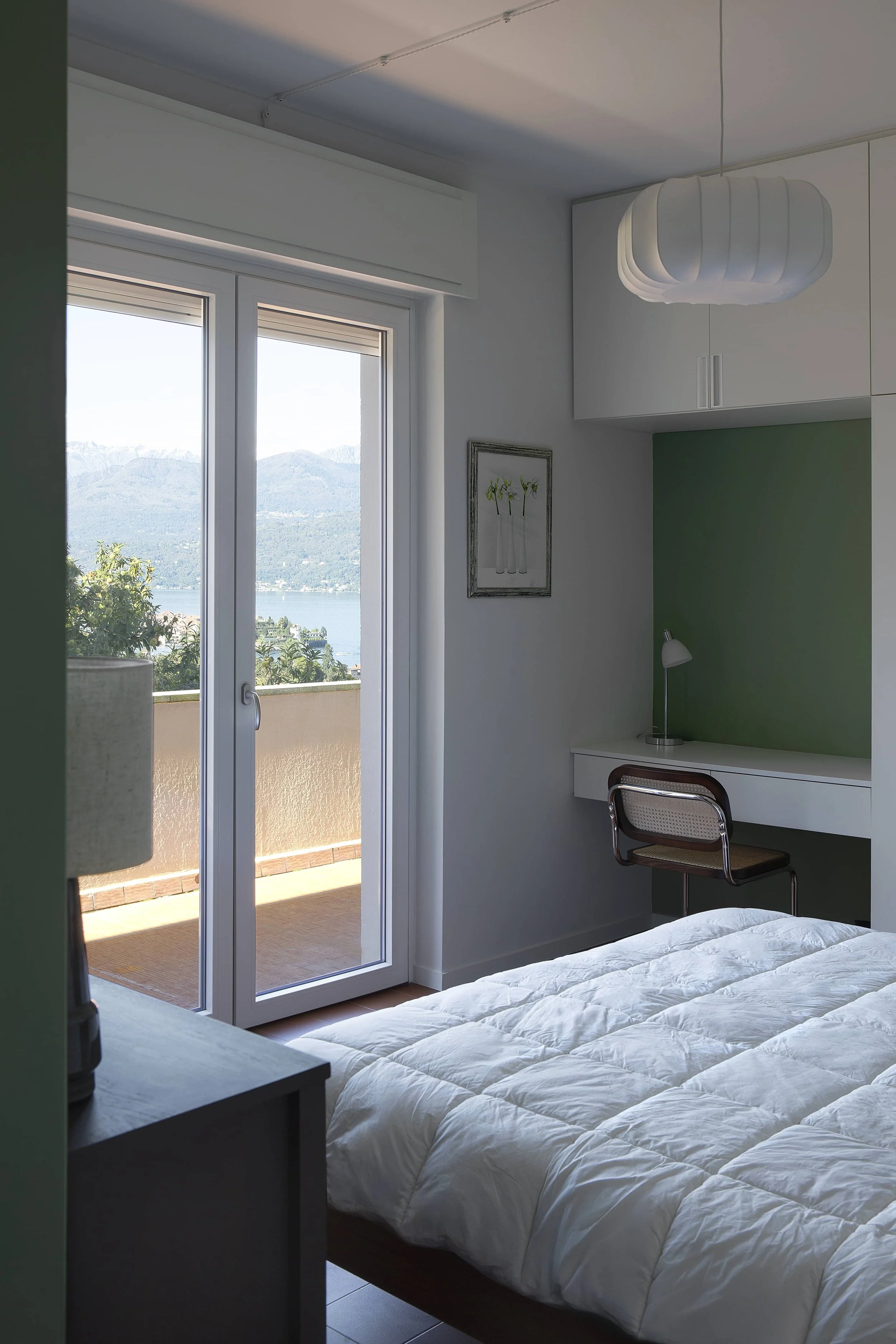 The project is guided by colors, with serene and luminous tones reflecting the atmosphere of the Lake. These harmonize with handcrafted cement tiles, Indonesian wooden furniture, custom-made pieces, and essential design elements. The kitchen, entirely custom-designed, opens onto a large window, maintaining a strong visual connection with the terrace. The bedrooms, featuring pastel palettes with contrasting accents, enhance the sense of calm and intimacy. The result is a carefully curated and welcoming space, modern yet timeless, designed to be truly lived in, rather than merely a display apartment.