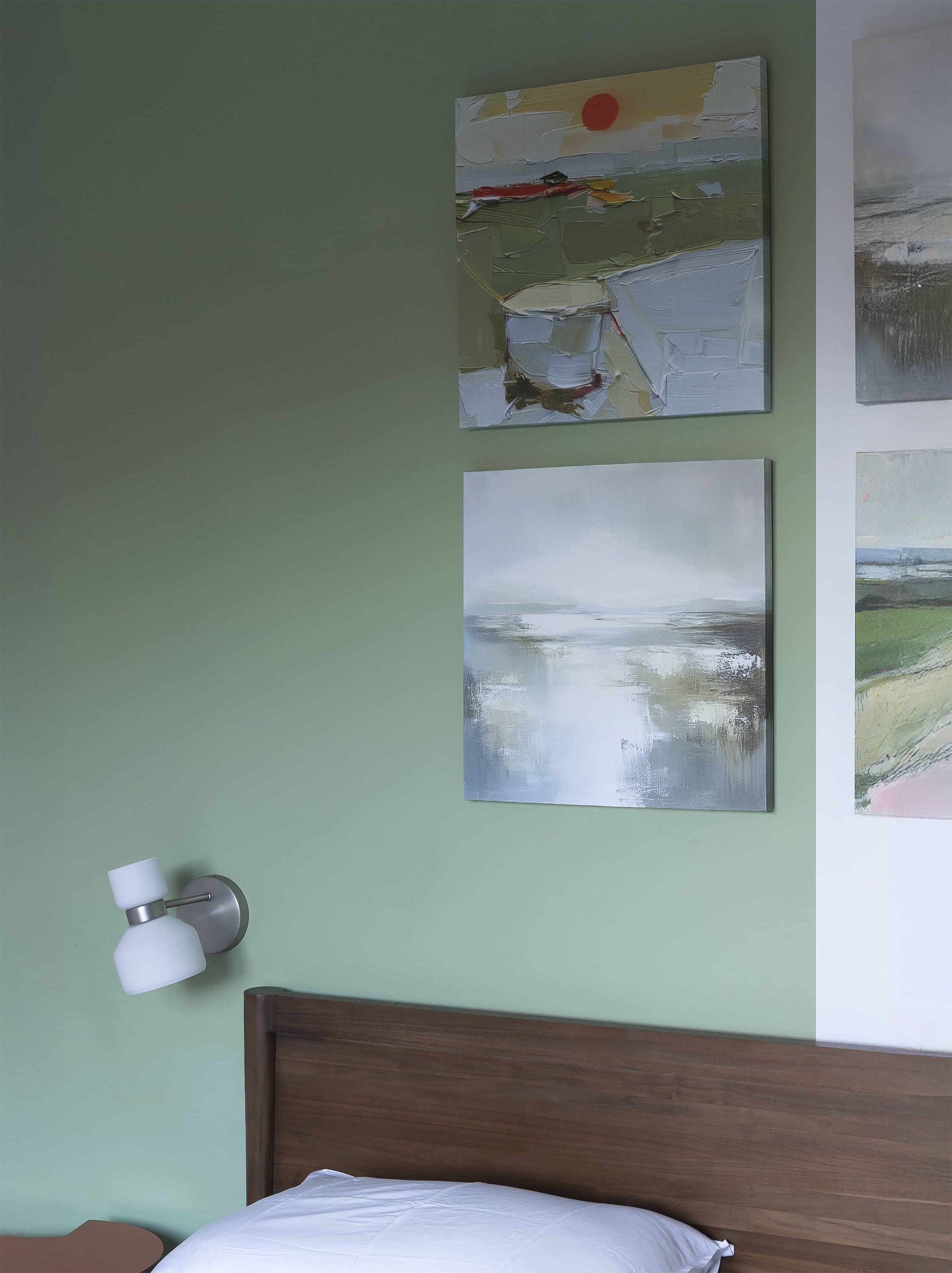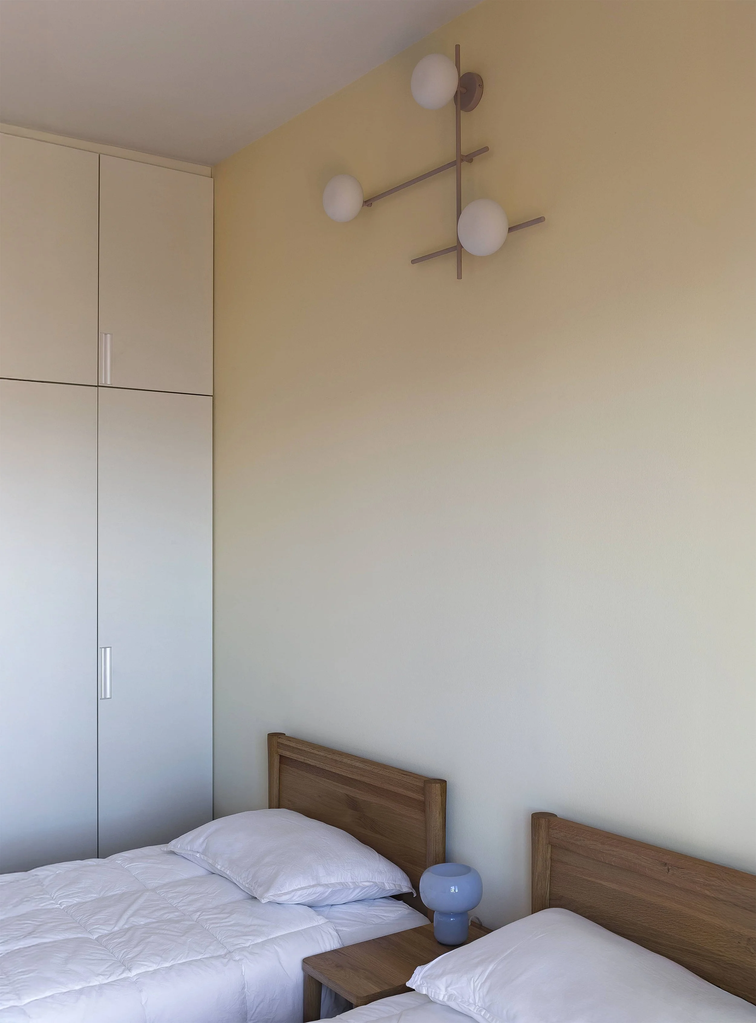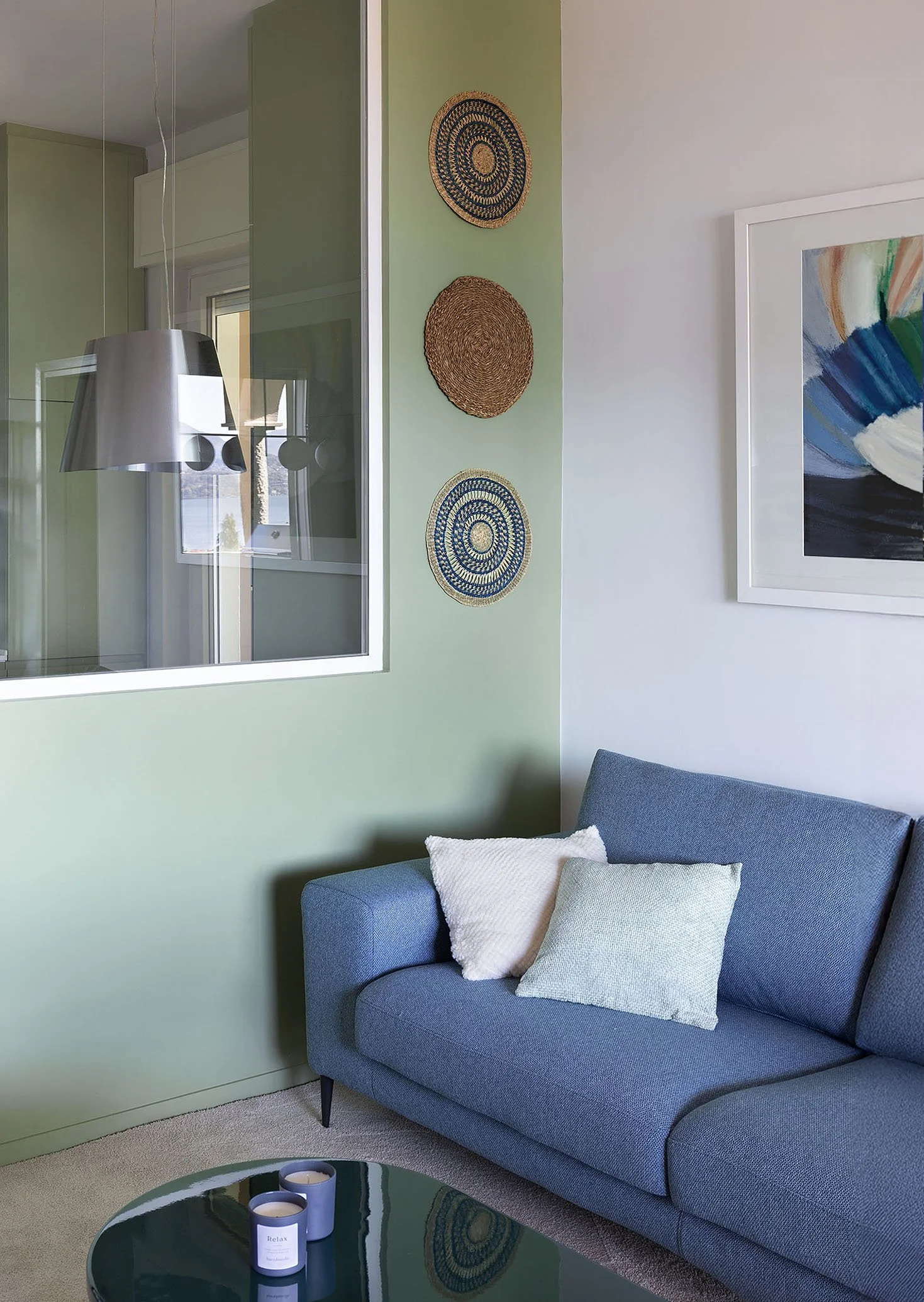 The project is guided by colors, with serene and luminous tones reflecting the atmosphere of the Lake. These harmonize with handcrafted cement tiles, Indonesian wooden furniture, custom-made pieces, and essential design elements. The kitchen, entirely custom-designed, opens onto a large window, maintaining a strong visual connection with the terrace. The bedrooms, featuring pastel palettes with contrasting accents, enhance the sense of calm and intimacy. The result is a carefully curated and welcoming space, modern yet timeless, designed to be truly lived in, rather than merely a display apartment.