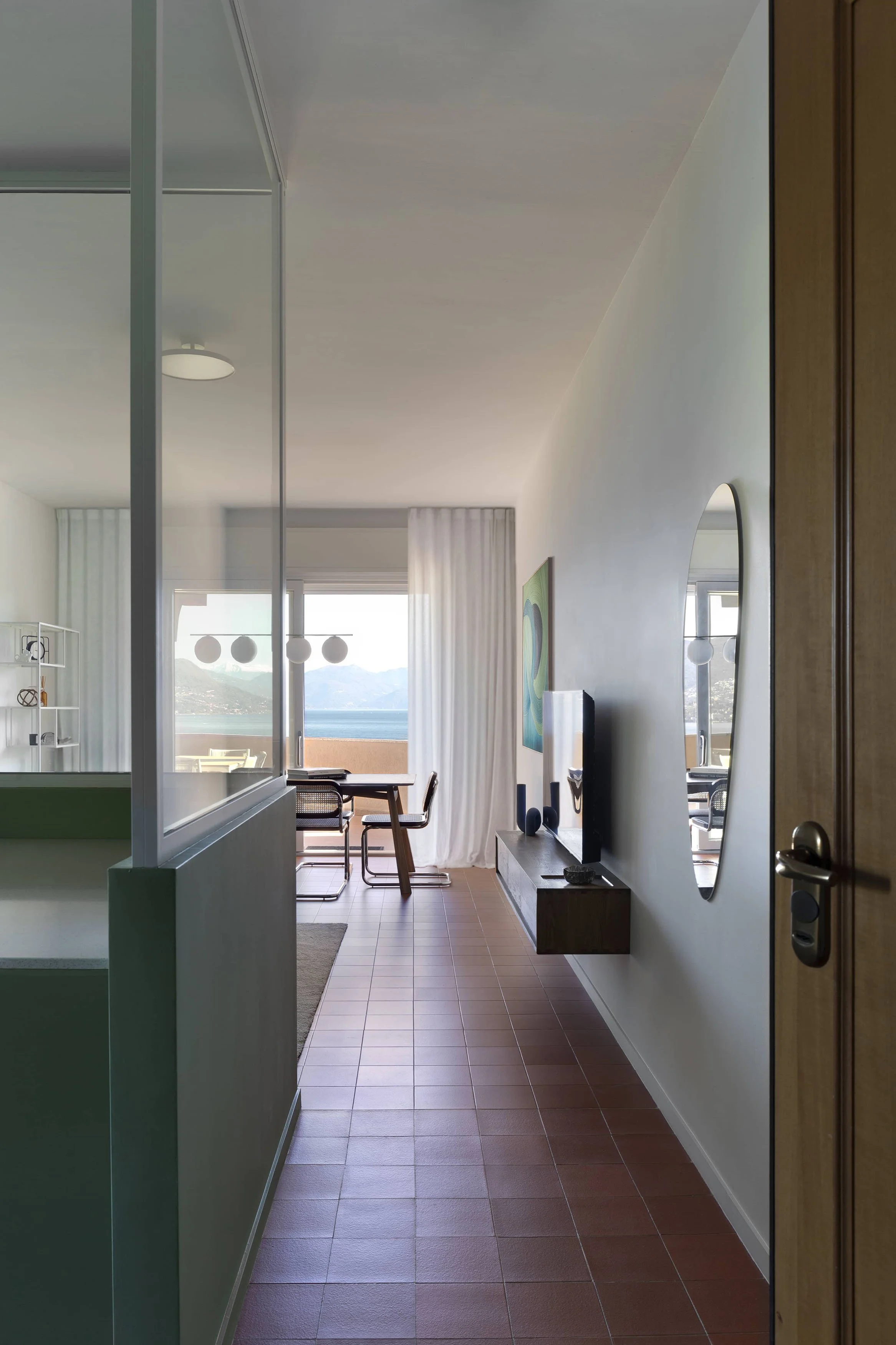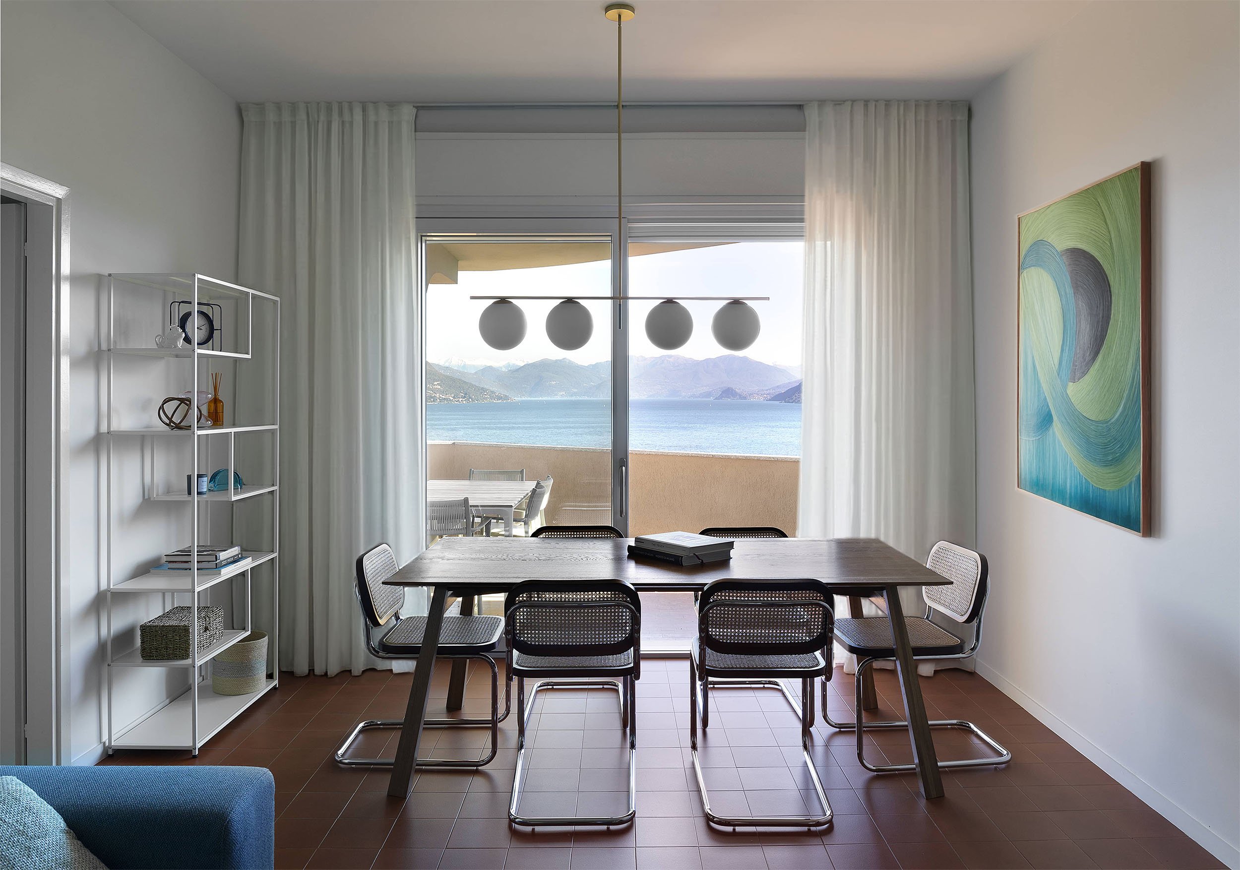 Renovation of a spacious apartment located within an iconic 1970s residential complex, overlooking Lake Maggiore with panoramic views of the Borromean Islands. Purchased by a couple living in Singapore as a holiday home and family retreat for their daughter Sara, the property was primarily chosen for its terrace, the true centerpiece of the project.