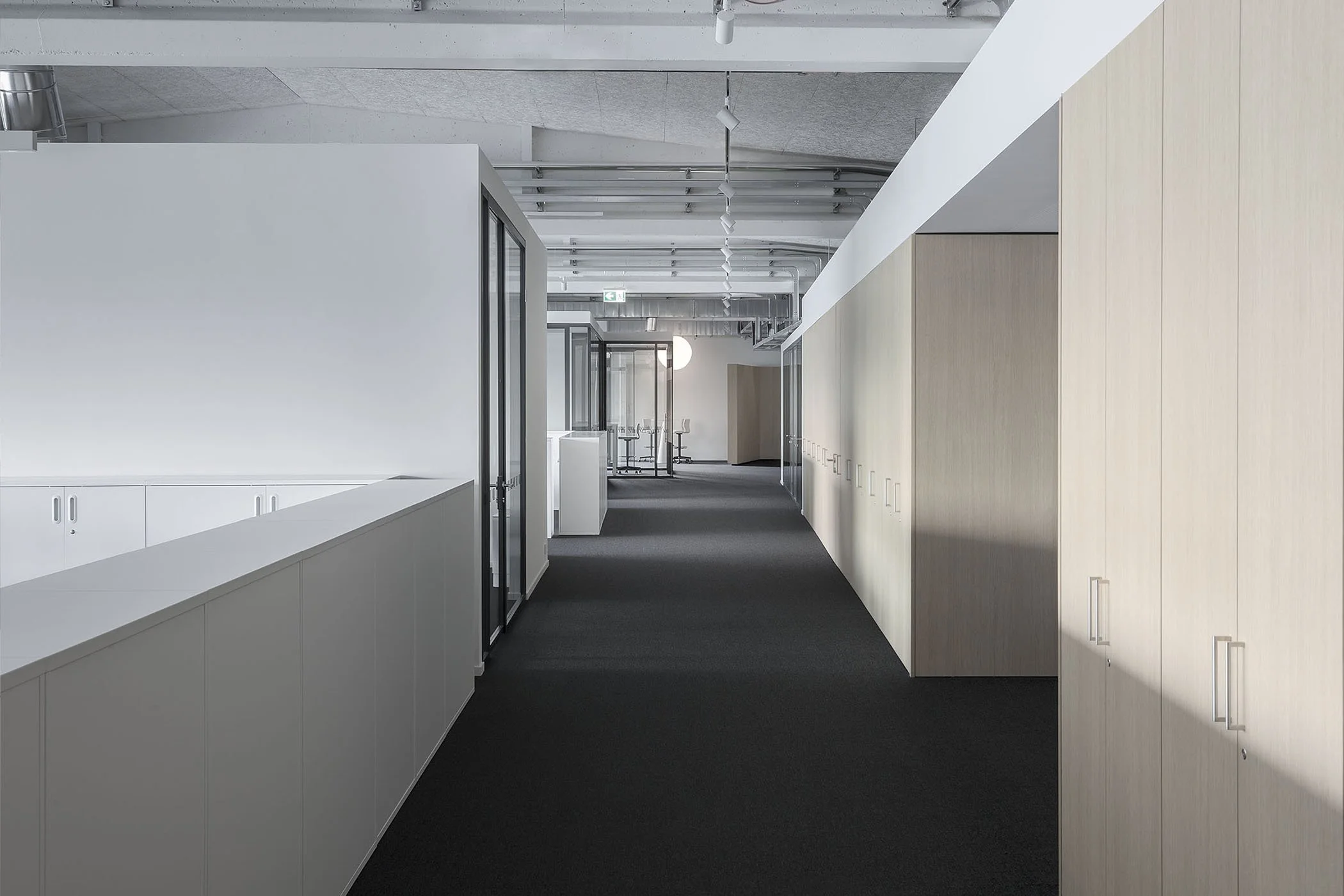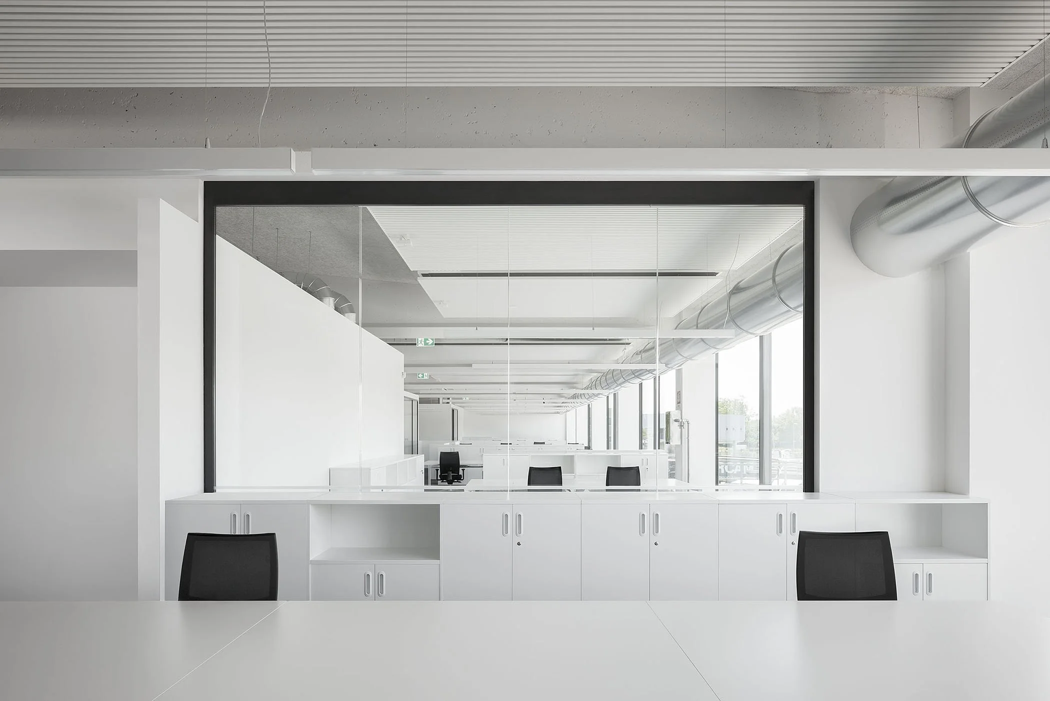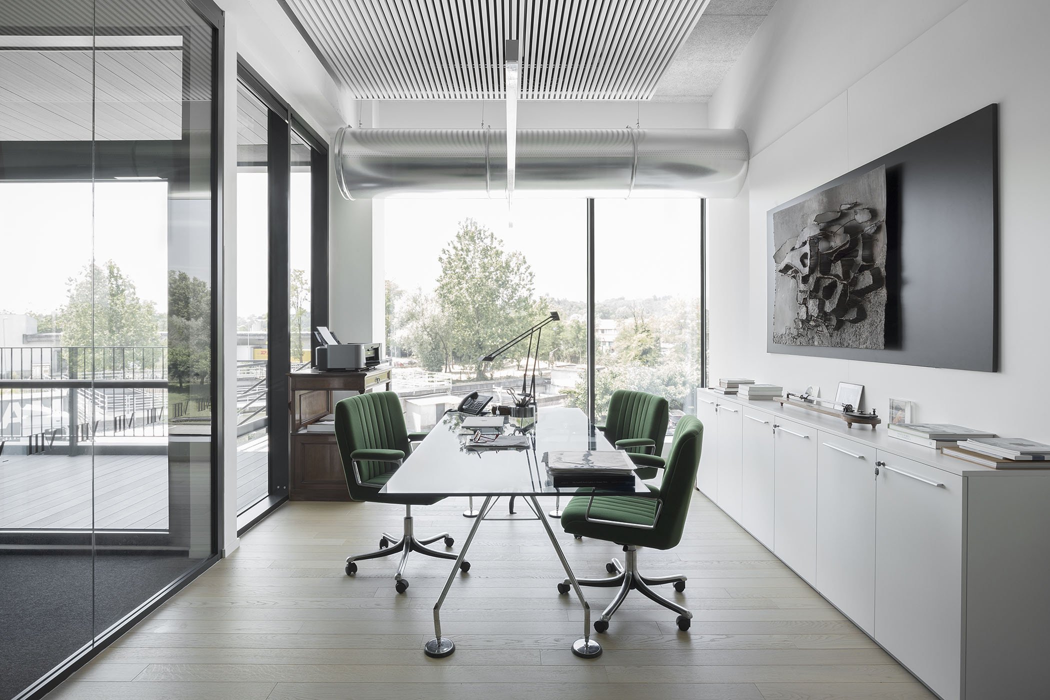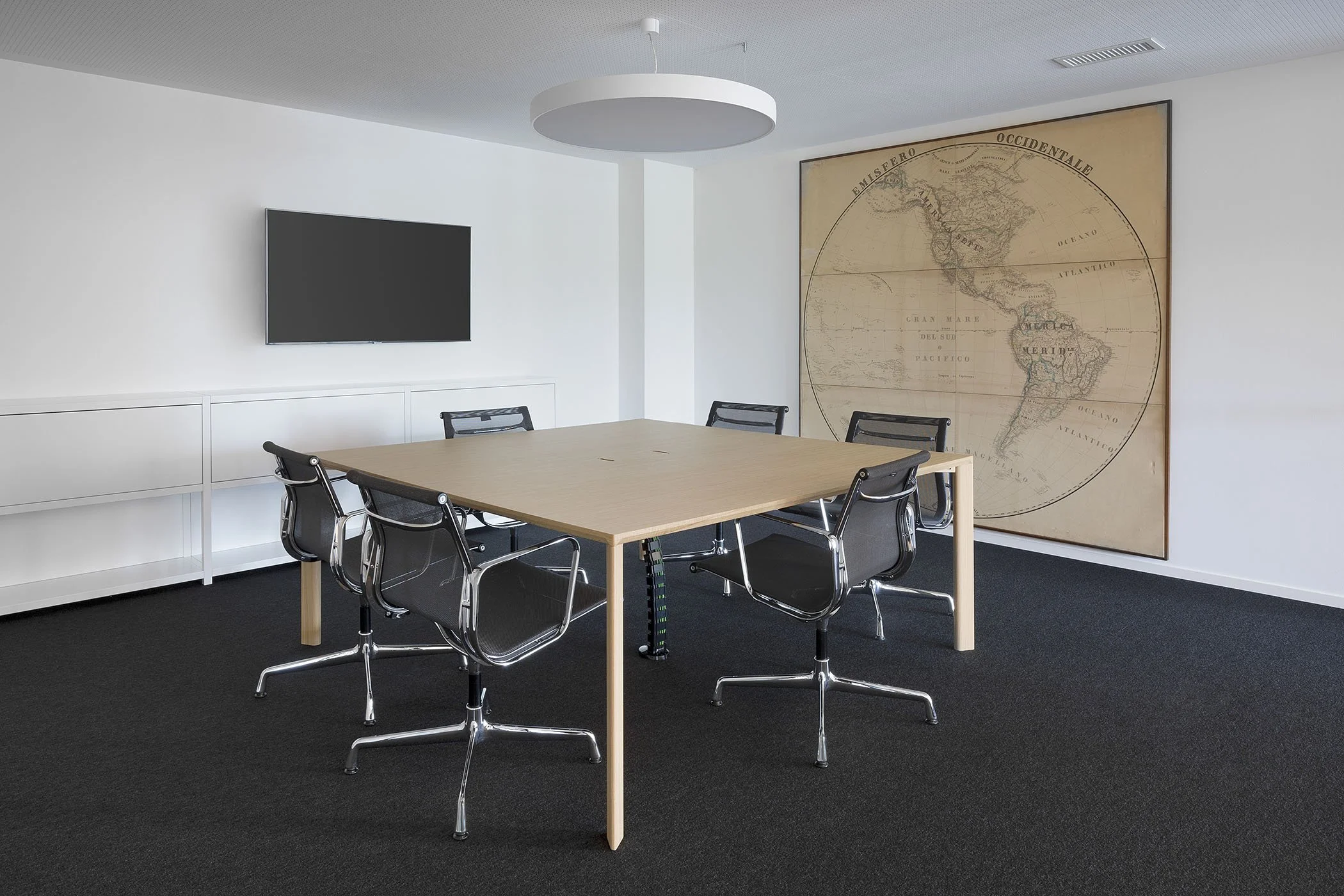 The project involved the transformation of a portion of the company’s industrial headquarters, aimed at integrating new executive offices and creating a representative environment. A key aspect was the complete renovation of the facade along the building’s long side, together with the reorganization of circulation routes and the vertical circulation cores. Interior spaces were arranged to accommodate 60 workstations, 9 meeting rooms, a main meeting room with 16 seats, 5 executive offices, as well as break areas, kitchen, facilities, and storage. Particular attention was devoted to building systems, incorporating state-of-the-art, high-efficiency solutions. Finishes, furnishings, acoustic and lighting systems were selected from leading industry brands. A complex intervention, executed through coordinated teamwork.