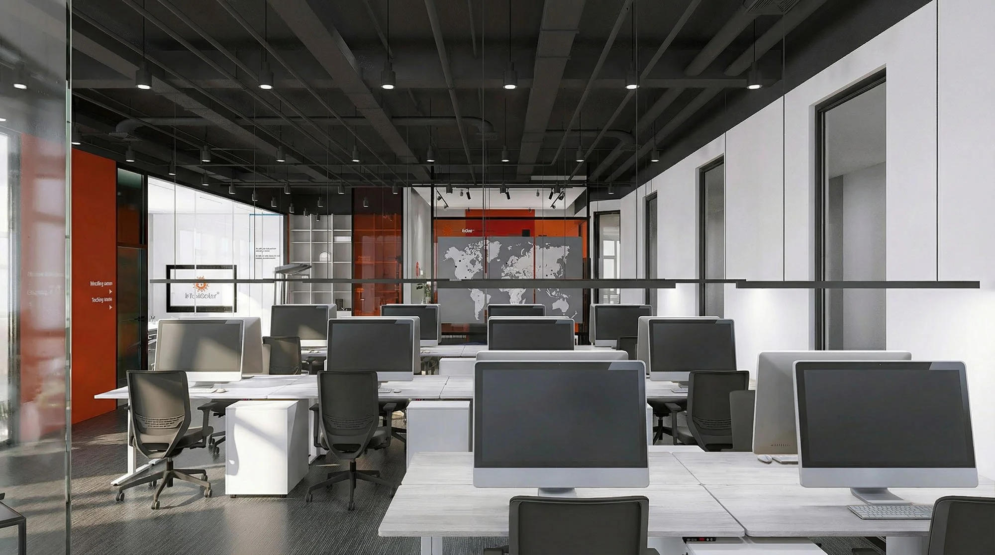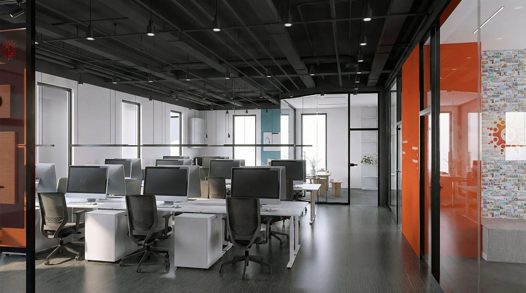 The entrance plays a key role in defining the brand identity: adjacent to it, an exhibition area showcases various products and experimental prototypes, immediately visible to visitors and clients. The distinctive orange of the brand is carefully applied in selected details and finds its strongest expression on the wall featuring the company logo in satin-finished steel, enhanced by integrated linear lighting. In chromatic contrast, blue appears in selected fabrics and furnishings. White and black define the overall balance: black, on ceilings and floors, integrates systems and lighting fixtures, while white characterizes the furniture and executive offices with a softer language. Glass partitions with dark frames allow natural light to flow from the private offices into the open-plan area.