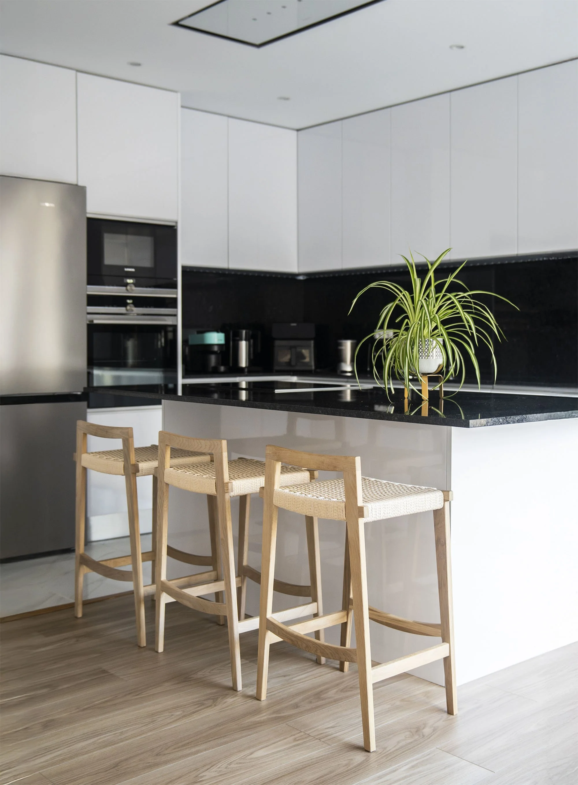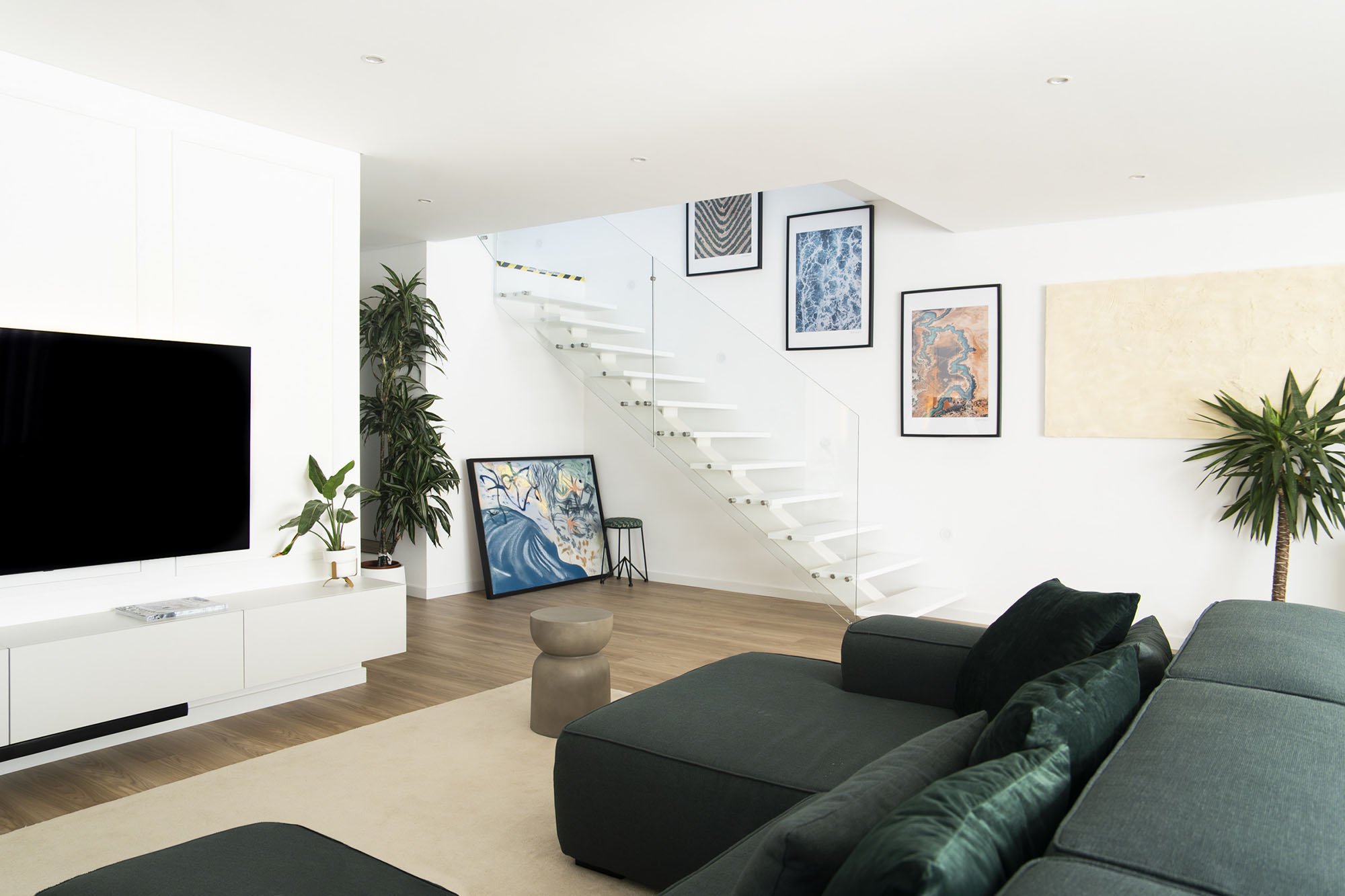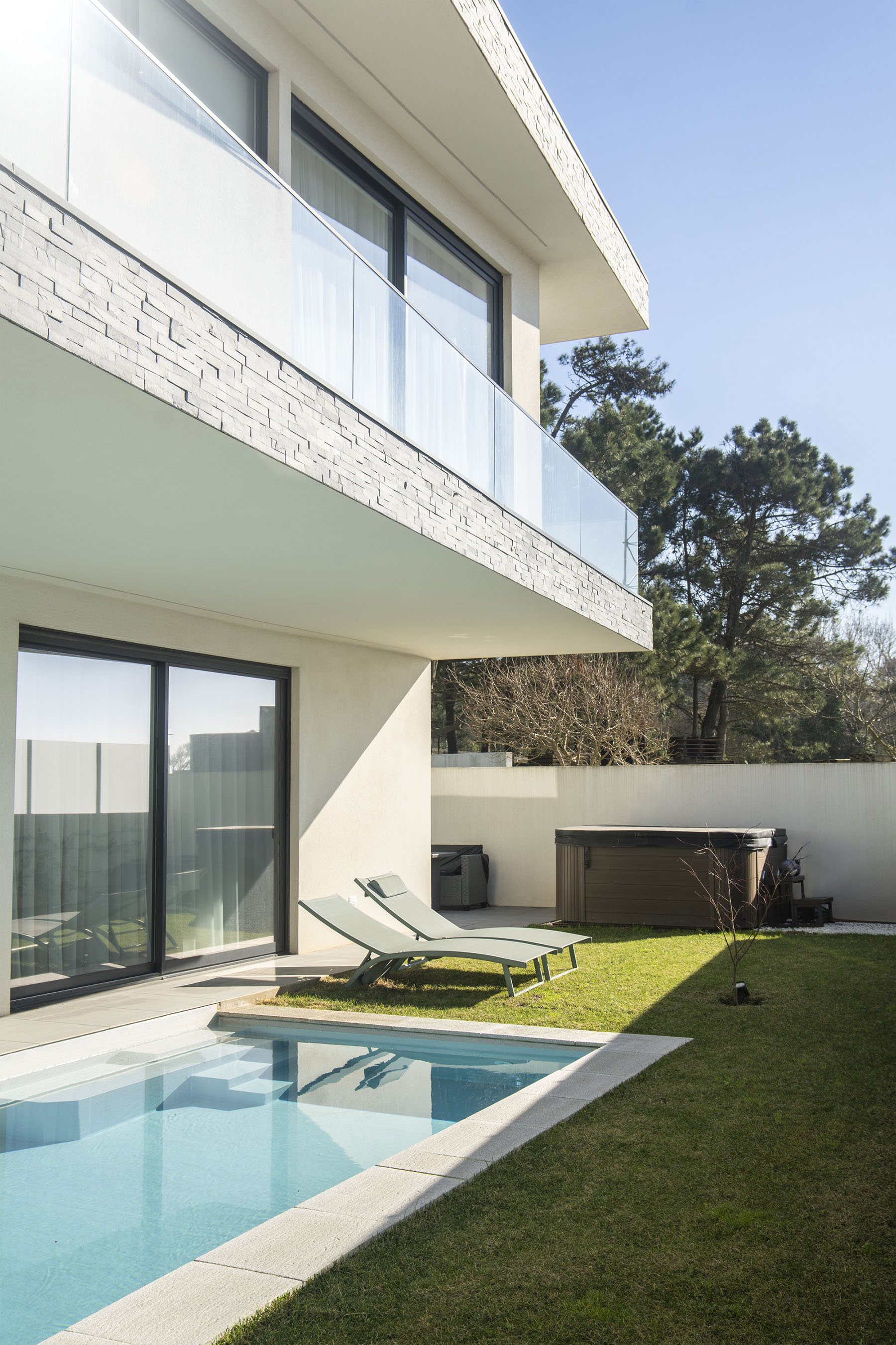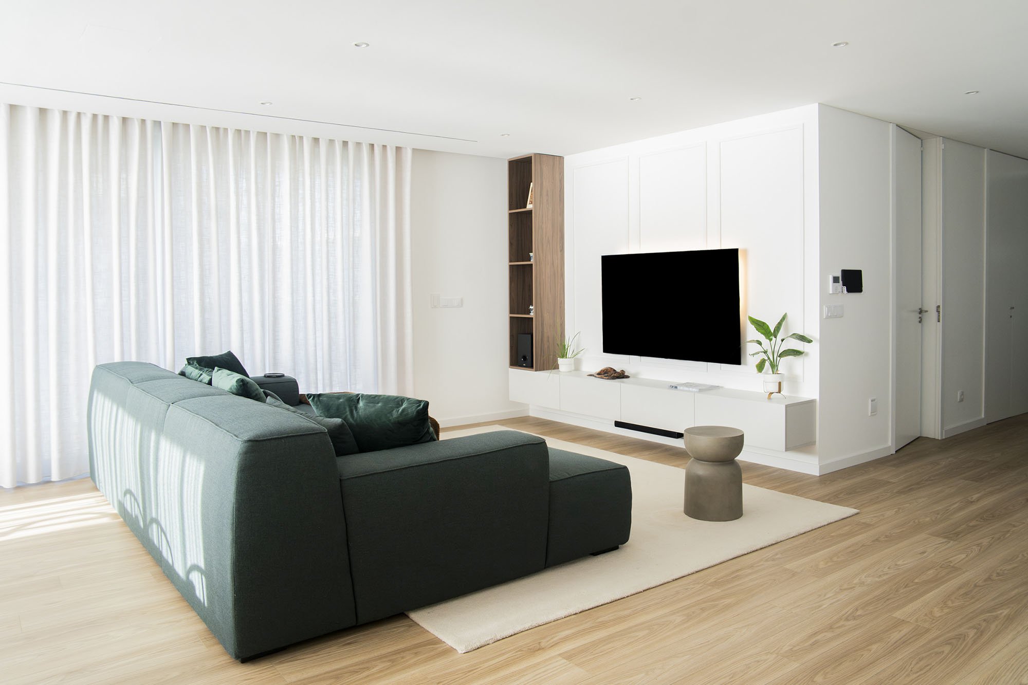 The intervention included a comprehensive redesign of furnishings and interior details, from bedrooms to the main living areas. Flooring and wall finishes were reconfigured to enhance material coherence. Custom sofas and bed headboards were crafted by local artisans, while bespoke boiseries and integrated home office elements contributed to a more articulated spatial rhythm. Material and textile choices followed a cohesive moodboard, combining the warmth of wood with existing black-and-white contrasts, enriched by earthy tones such as terracotta and deep green. Natural light, a defining architectural feature of the villa, was treated as a primary compositional element, reinforcing continuity throughout the interiors. Attention was given to visual cohesion across furniture, décor, artworks, and outdoor areas, including the garden and pool. The result is a measured, luminous, and cohesive home that enhances the architectural language of contemporary Portuguese residences.
