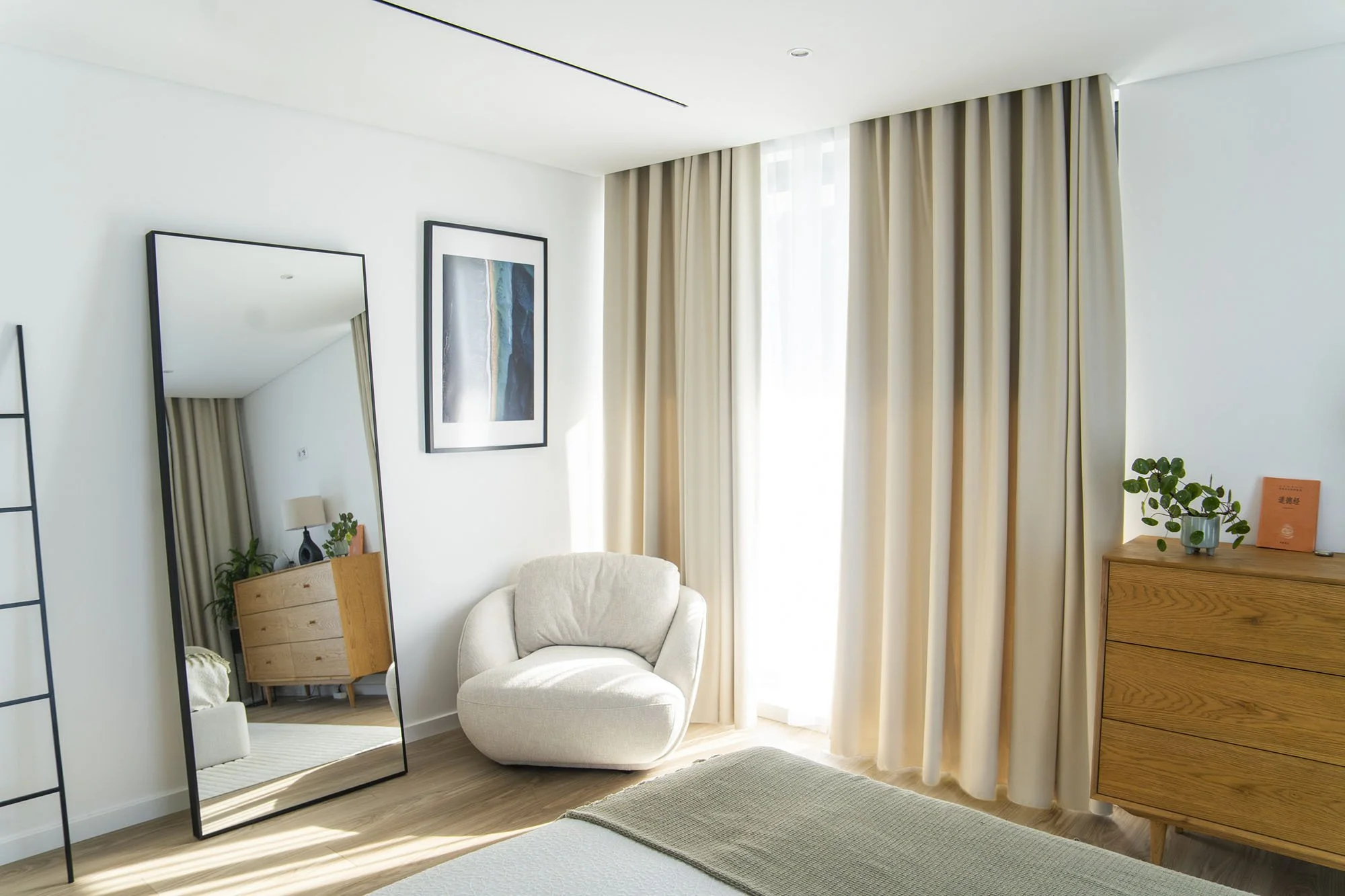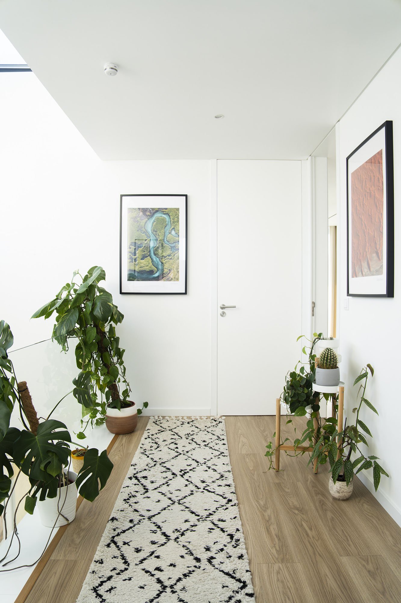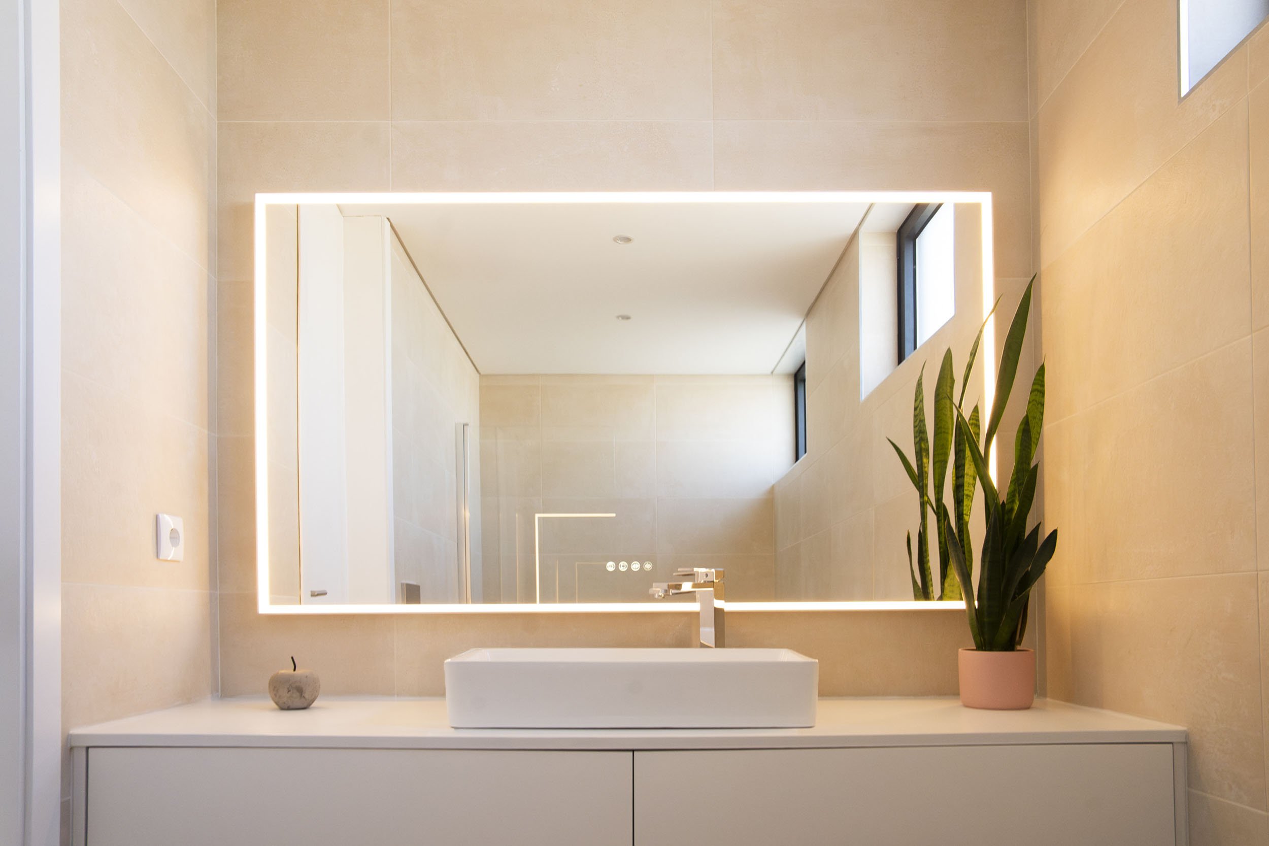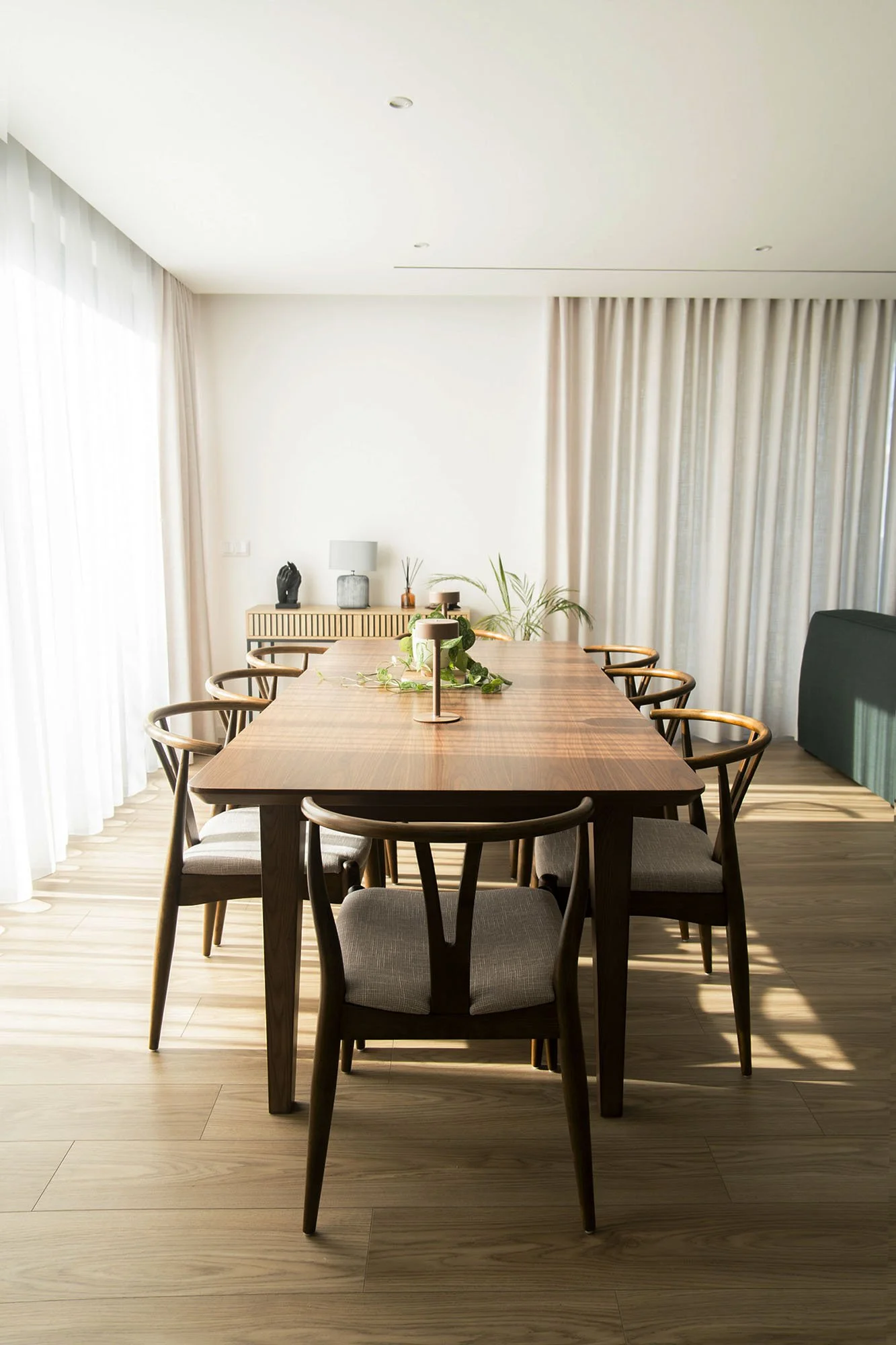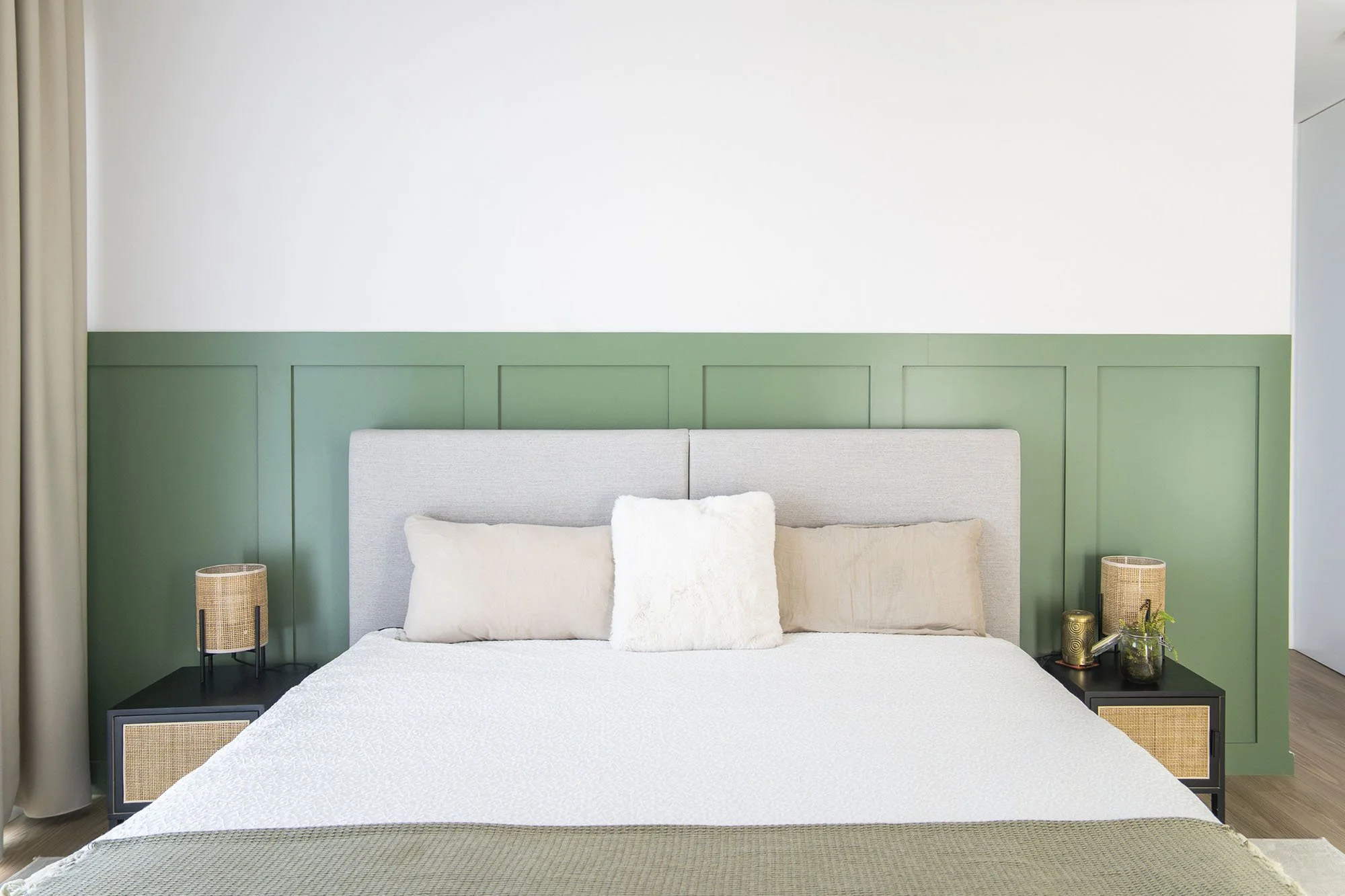 The intervention included a comprehensive redesign of furnishings and interior details, from bedrooms to the main living areas. Flooring and wall finishes were reconfigured to enhance material coherence. Custom sofas and bed headboards were crafted by local artisans, while bespoke boiseries and integrated home office elements contributed to a more articulated spatial rhythm. Material and textile choices followed a cohesive moodboard, combining the warmth of wood with existing black-and-white contrasts, enriched by earthy tones such as terracotta and deep green. Natural light, a defining architectural feature of the villa, was treated as a primary compositional element, reinforcing continuity throughout the interiors. Attention was given to visual cohesion across furniture, décor, artworks, and outdoor areas, including the garden and pool. The result is a measured, luminous, and cohesive home that enhances the architectural language of contemporary Portuguese residences.
